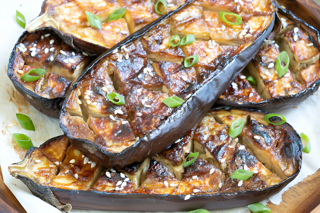 - Preheat the oven to 400°F (200°C). Wash the eggplants thoroughly and pat them dry. Slice each eggplant in half lengthwise. Place them cut-side up and use a sharp knife to score the flesh, making deep lengthwise cuts followed by diagonal cuts to create a diamond pattern.